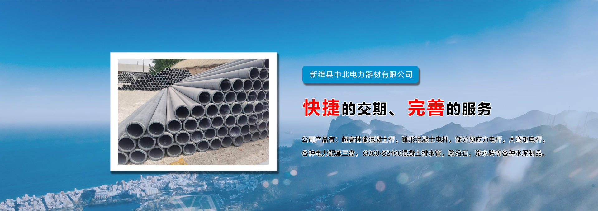 我公司主要生产超高性能混凝土杆、非预应力锥形水泥杆、大弯距电杆、等径电杆、部分预应力锥形水泥杆等系列产品,年产量达6万余根,产品主要供应于山西、河南、陕西等周边省市。历年来中标国网电力、地方电力、移动、联通等公司项目,得到大家一致好评。